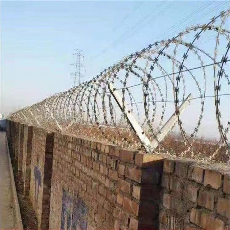 蛇腹形(型)刀刺網采用刀片刺繩繞圈后相臨兩圈每隔120°用刺絲連接卡固定,張開后形成蛇腹網狀,閉合后刀片刺繩圈徑為50cm,張開后每交叉