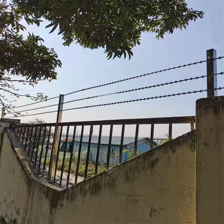 2、磚墻圍界刺繩護欄網安裝工藝磚墻頂部鉆孔→安裝支架→刺繩安裝→刺圈網排放、拆包、接頭→安放至圍界頂部→精細調整→固定。